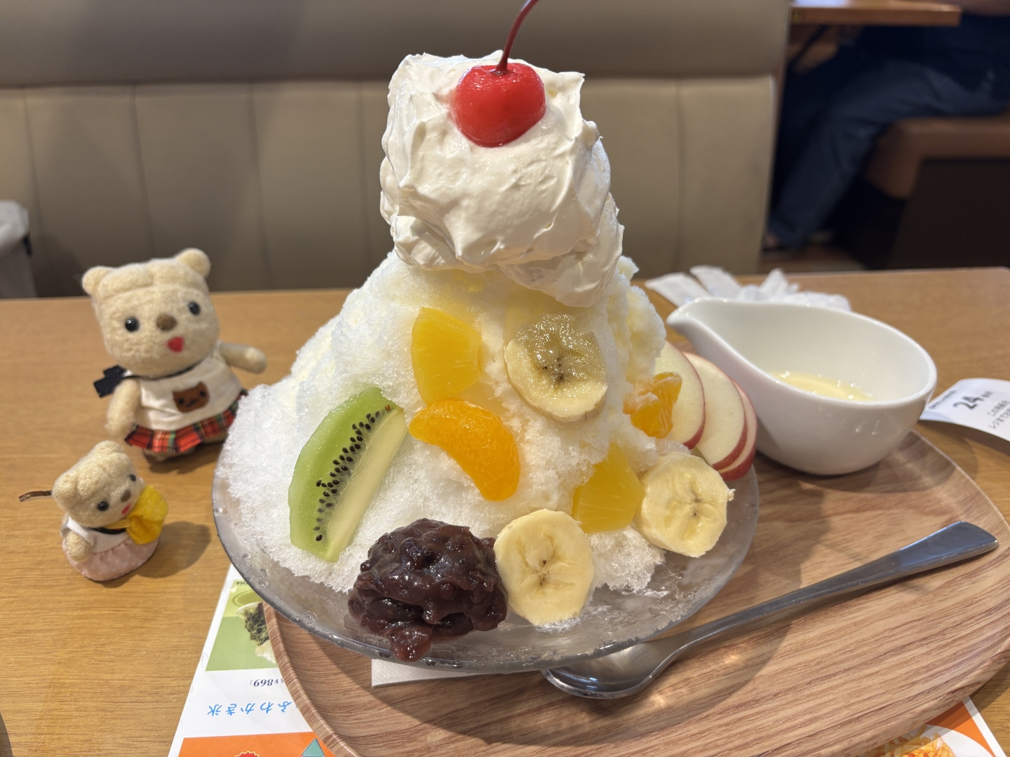 かき氷の部分には、キューイ、バナナ、ミカン、パイン、リンゴ、そして、甘いあずきが乗っていて、そこに練乳をたっぷりかけて頂くのだ。