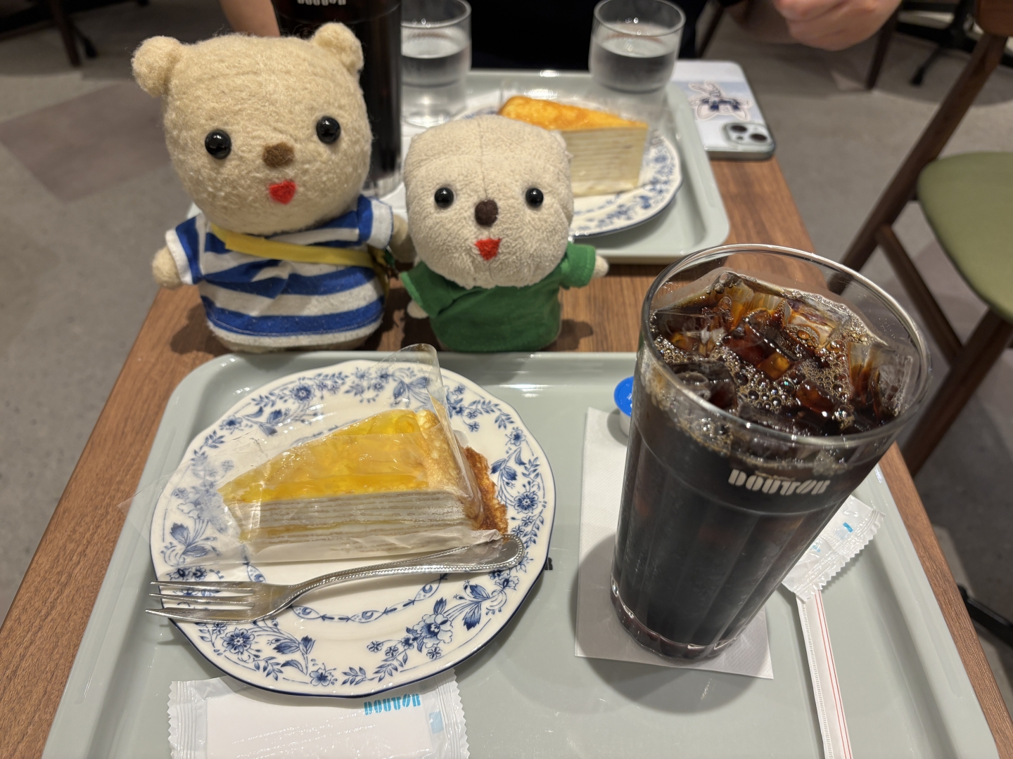 少しよばれるのだ。キャラメル風味のクレープ生地とホイップクリームが交互に重なって、ふんわり、しっとり、やさしい口あたり。甘さもちょうどよくて、思わず笑顔になるおいしさ。ちょっと渋めのアイスコーヒーとの相性もバッチリなのだ。