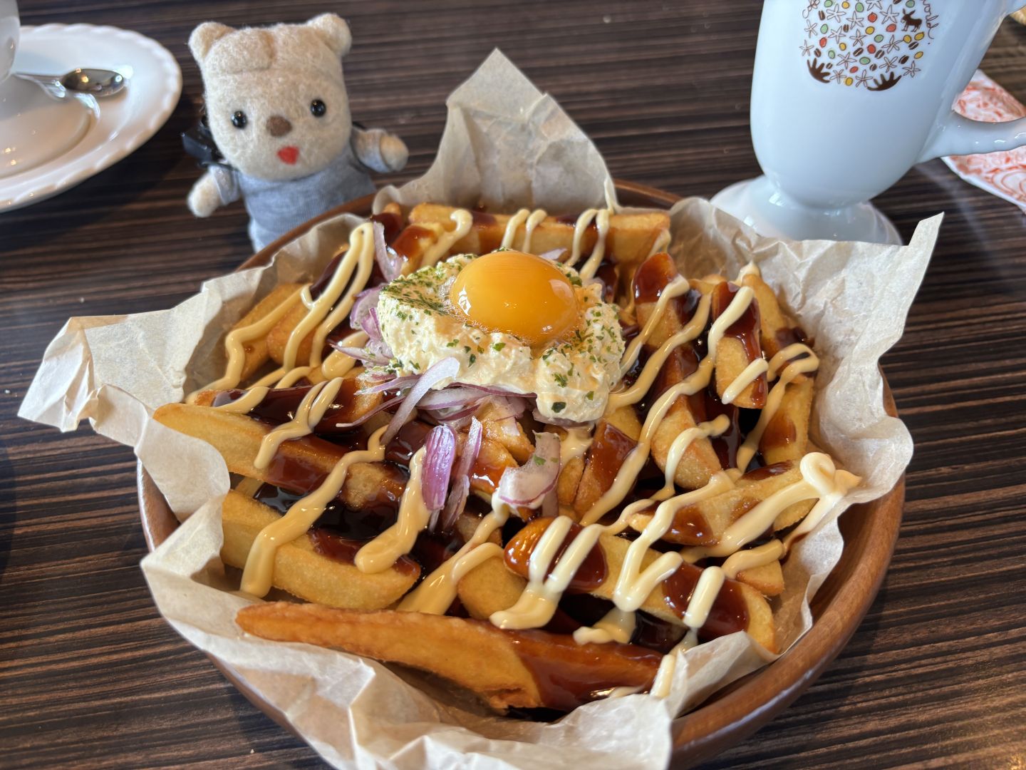 熱々のフライドポテトの上に、まろやかなマヨネーズとポテサラ、そしてとろ〜り卵がのっている。