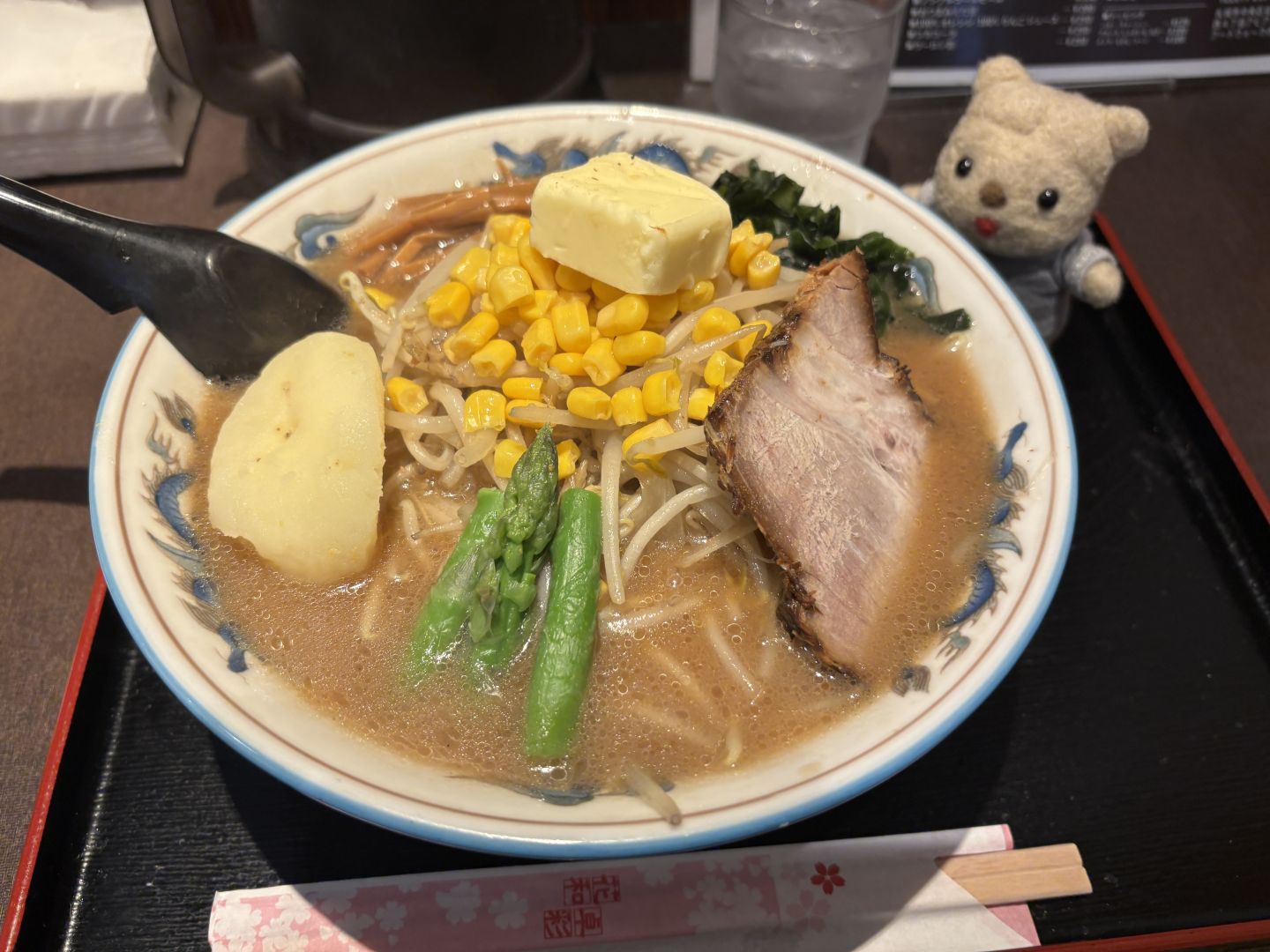 「バター」「コーン」「じゃがいも」「アスパラ」「チャーシュー」と、札幌近郊の名物が勢ぞろい。まさに全乗せ、フルスペック仕様の豪華ラーメンなのだ。